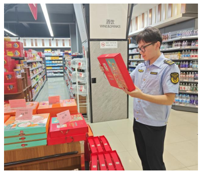 严查过度包装,倡导绿色消费。依据《限制商品过度包装要求食品和化妆品》(GB23350 —2021),执法人员重点检查月饼包装是否使用贵金属、红木等贵重材料,包装层数是否过多,包装体积是否过大,是否存在销售月饼搭售其他商品或以礼盒等形式将月饼同其他产品混合销售的行为。执法人员积极向经营者宣传绿色低碳包装理念,引导经营者自觉拒绝售卖过度包装商品,严格遵守法律法规及相关政策,营造良好的社会氛围。