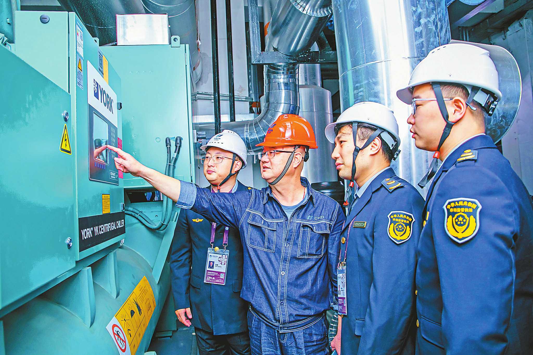 为确保第八届中国国际进口博览会特种设备使用安全,上海市青浦区市场监管局对位于青浦区的国家会展中心(上海)场馆特种设备持续开展监督检查,保障安全平稳运行。图为11月3日,执法人员对压力容器进行检查。□谭维杰/摄