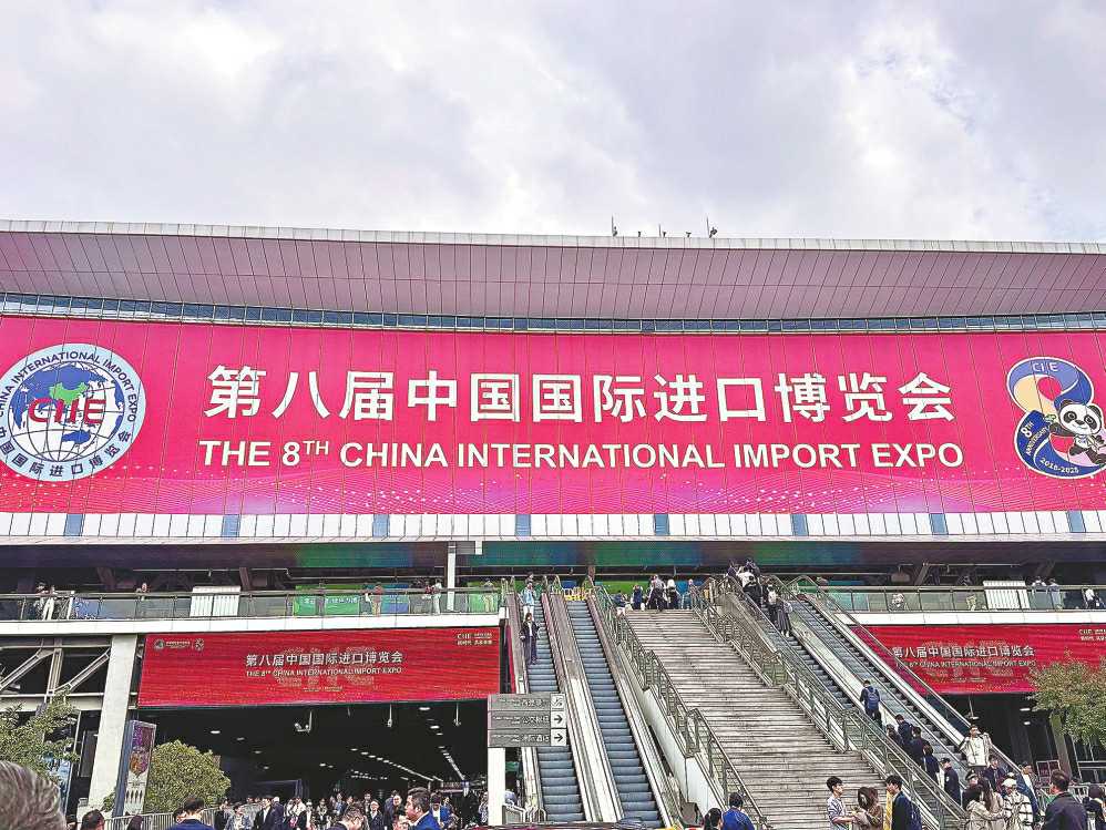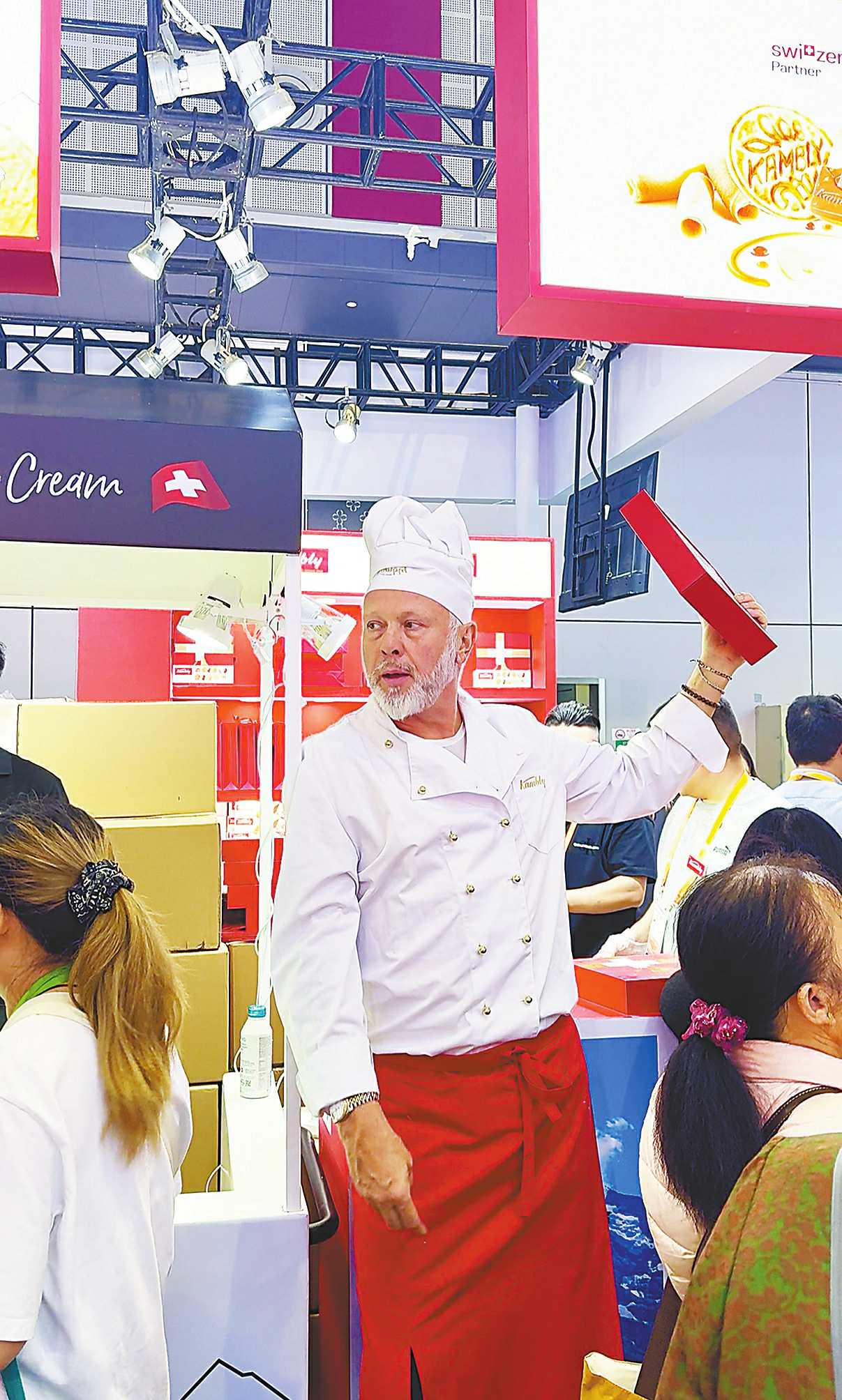 图1:本届进博会企业展设置医疗器械及医疗保健、汽车及智慧出行、技术装备、消费品、农食产品、服务贸易六大展区,并同期举办涵盖“保护知识产权 打击侵权假冒国际合作分论坛”等主题的第八届虹桥国际经济论坛。 图2:农食产品专区的瑞士某食品品牌工作人员用中文介绍产品,吸引众多参展观众前来试吃。