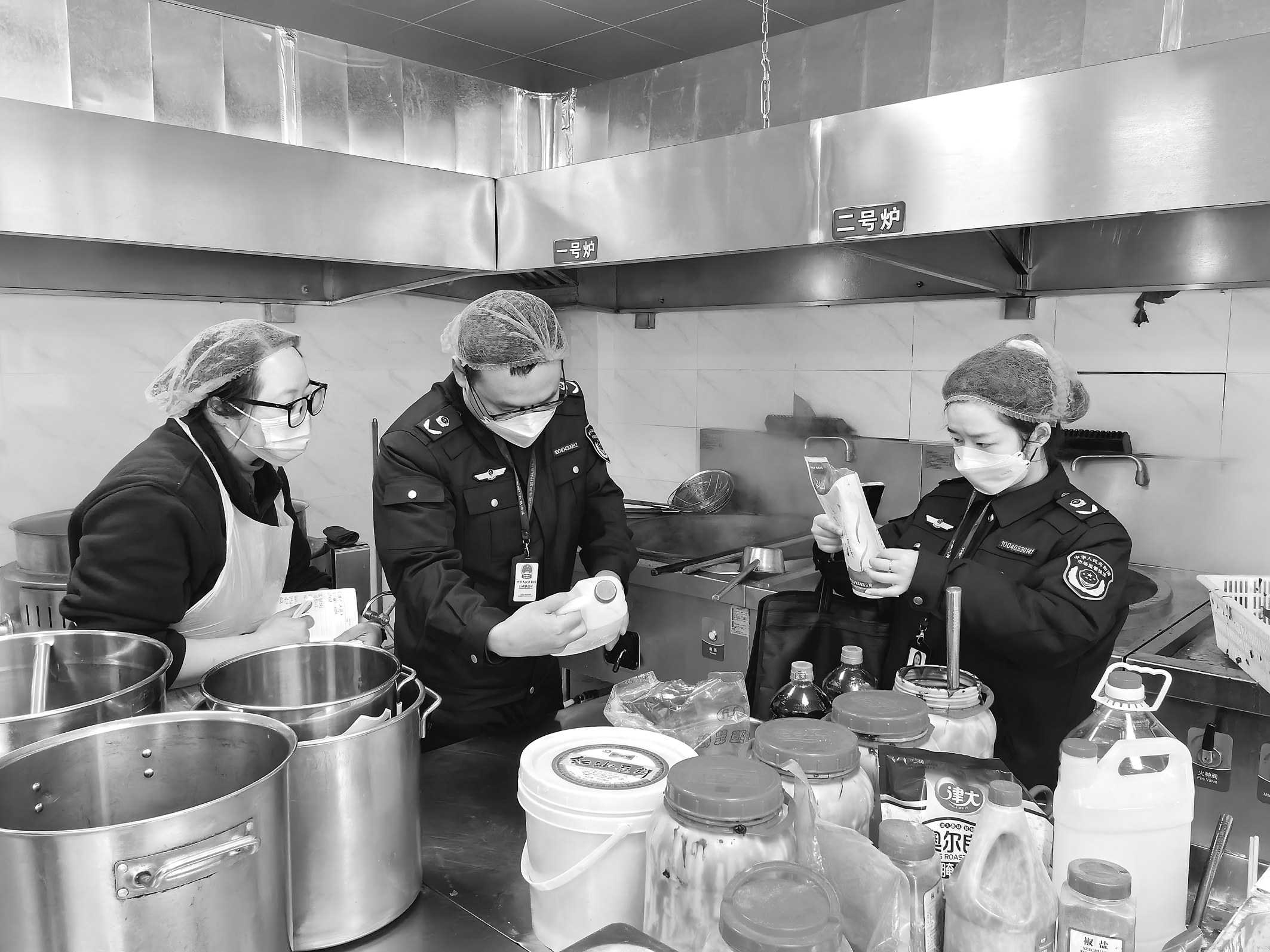 连日来,江苏省常州市武进区市场监管局高新区分局全面排查学校食堂食品安全风险隐患,持续保障校园饮食安全。图为该分局执法人员在一家学校食堂后厨检查食品安全相关情况。□李艳青/摄