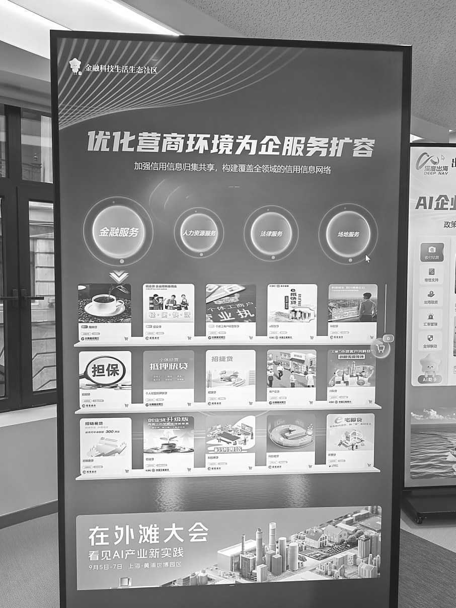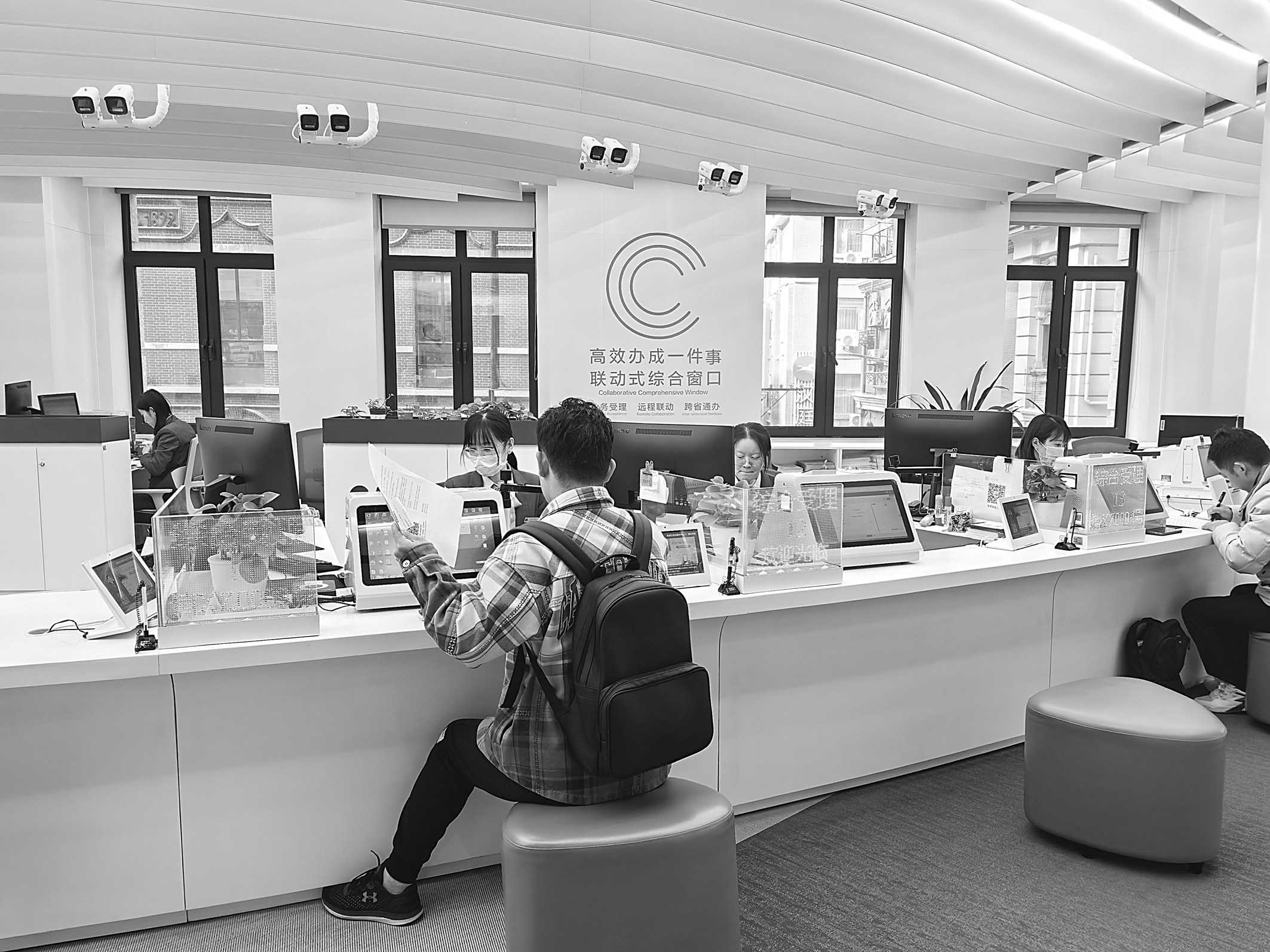上图:上海市黄浦区政务服务中心办事大厅“高效办成一件事”联动式综合窗口为办事人提供跨省通办、远程联动等企业登记注册、变更服务。| 右图:上海市企业办事人可以通过操作办事大厅的电子触摸屏,点击金融、法律、人力资源等所需办理项目,形成服务“菜单”,实现“点单式”服务。