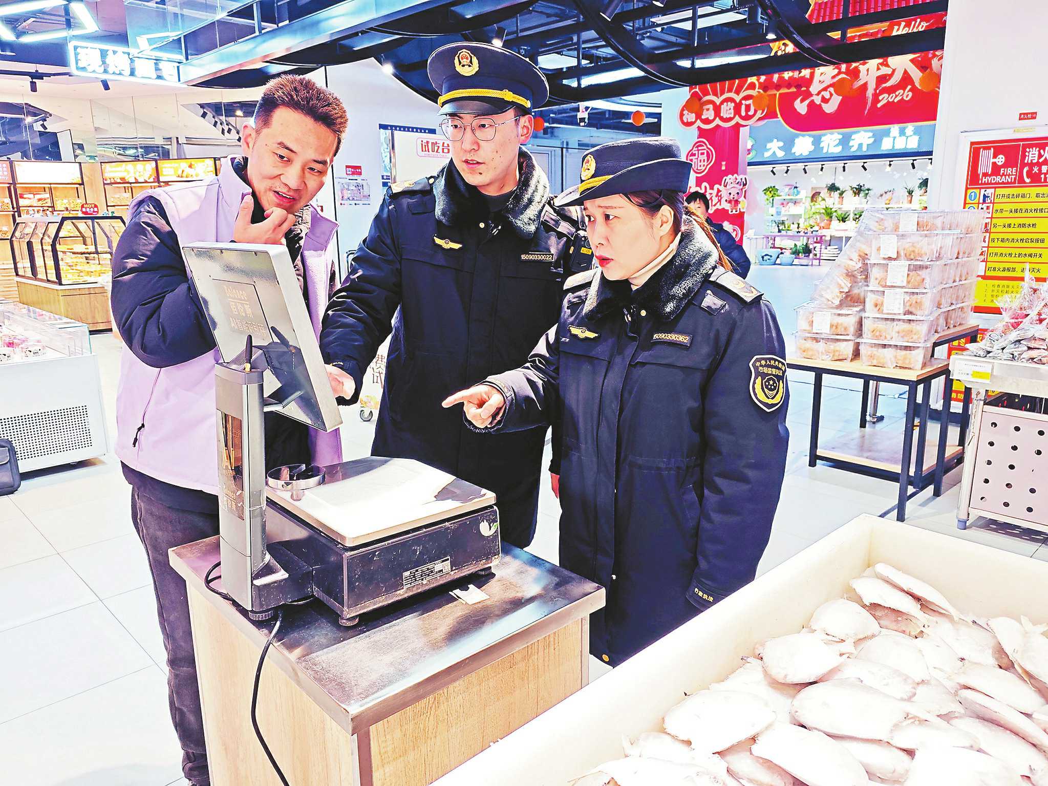 1月22日,山东省宁阳县市场监管局执法人员深入辖区商超,开展节日期间计量器具专项监督检查,累计检定电子秤逾50台次。图为执法人员对在售生鲜、散装食品区域的电子秤进行检定,重点核查设备是否存在未经检定、铅封破损、作弊改装等违规行为。□何敬华于亭亭/摄影报道