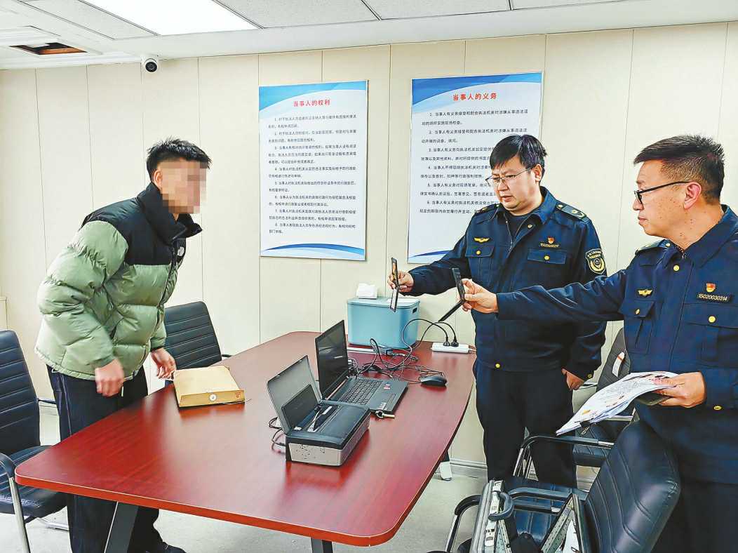 山东省青岛市市场监管局查处青岛科曼奇商贸有限公司发布非医疗、药品、医疗器械广告使用医药用语行为案,涉事企业被罚款10万元。图为2025年4月23日执法人员在执法调查室对当事人开展调查。