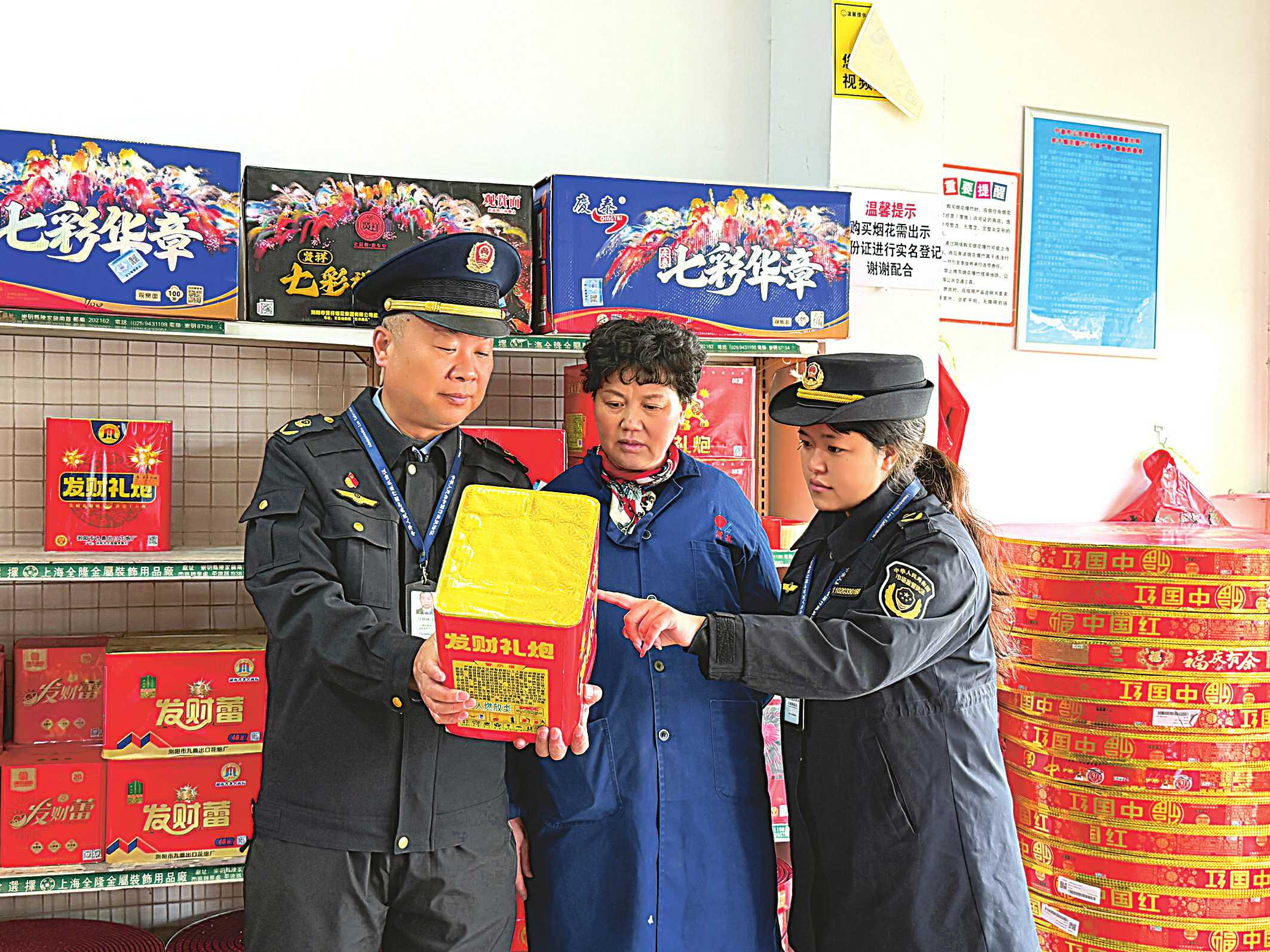 连日来,浙江省宁波市镇海区市场监管局执法人员深入烟花爆竹经营点开展专项检查,严把产品质量关,筑牢安全防线。图为执法人员查看产品包装标志标识是否规范。□陈江淋/摄